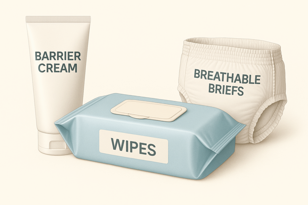 • Choose breathable, high-absorbency incontinence products that wick moisture away and keep skin drier for longer.